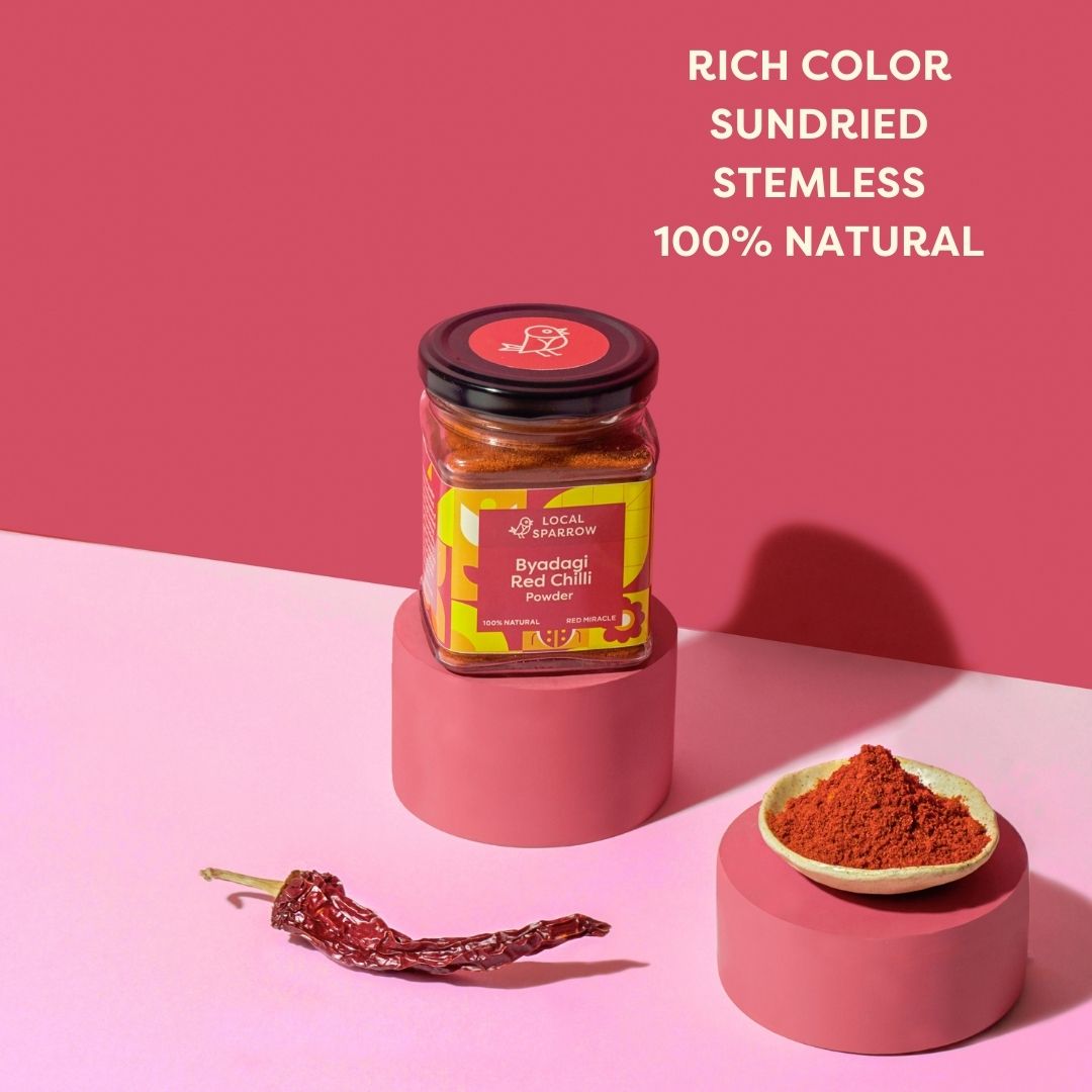 Our Byadagi chilli powder is from Karnataka and our Sankeshwari chilli powder comes from Sankeshwar, a small town near Kolhapur. While Byadagi adds a deep red color to the food you make, Sankeshwari adds a fierce, spicy taste. Additive free and completely natural, our chilli powders are made from clean and fresh, stemless and sundried whole chillies. You will love it!